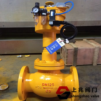 一,常閉式緊急切斷閥:該閥在日常使用中處于常閉狀態, 電磁閥和氣源處于不工作狀態(無電能消耗),當工作需要閥門打開時,通過工作臺操作按鈕使電磁閥控制的氣動執行機構工作將閥門開啟。反之,遇到緊急情況時,斷電閥門緊急關閉(切斷)。切斷閥內部可以設置易熔合金在外界溫度達到80度時熔化,堵塞氣管閥門及時關閉閥門,起到緊急切斷作用。 常開式緊急切斷閥:該閥在正常的情況下處于常開狀態,電磁閥和氣源處于不工作狀態(無電能消耗),當遇到需要把閥門關閉時,通過電磁閥控制的氣動執行機構將閥門關閉(一般情況下,常開型閥門不用于易燃易爆場合)。常開式切斷閥多安裝在工廠生產管路,與防爆切斷(氣動元件)電源和集控系統( DCS)可編控制器(PLC)等開關信號或泄露探測儀表、壓力控制儀連接。在探測過程中發現泄露、壓力控制儀器壓力過高/低時,通電關閉,以***時間切斷介質來源,避免事態發生,以免影響正常生產。 B:雙作用式工作原理: